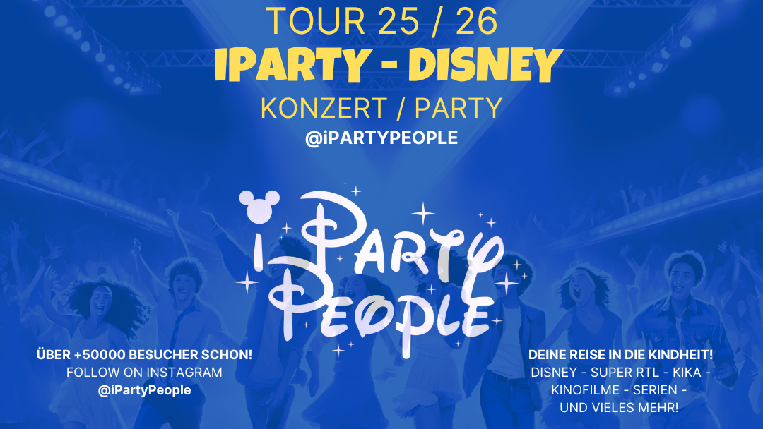 iPartyPeople nimmt euch mit auf eine Reise zurück in die Vergangenheit und bringt die besten Hits aus eurer Kindheit auf die Bühne. Ob Disney, Nickelodeon, Super RTL, Kultserien oder Kino-Klassiker, sie haben die unvergesslichen Sounds, die jede Party einzigartig machen. Freut euch auf viele Specials, aufregende Acts und überraschende Highlights, die euch eine völlig neue Art einer Party/Konzert zeigen. Das Motto: "Einmal zurück in die Kindheit – und noch viel mehr!"